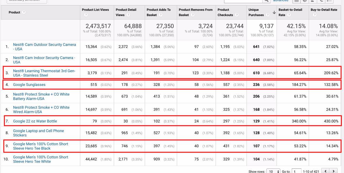 Kullanıcının ödeme noktasına girdiğini, ardından ikinci adıma geçip birinci adıma geri döndüğünü hayal edin. Google Analytics, verileri daha ilk adımdan “Product Checkout” metriğine alır. Bu durumda verileri iki kez gönderirsiniz. Elbette, ayrıntıya ekle ve Ayrıntıya göre satın alma oranından ödeme kaybını hesaplamak mümkündür. Google Merchandise mağazasından örnek: