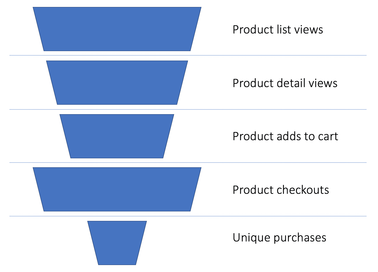 Gelişmiş e-ticaret, ilk izlenimden ürün satın almaya kadar tüm ürün hunisini oluşturmamıza da izin vermelidir. İdeal dünyada, belirli bir ürün için şuna benzer bir şey olmasını bekleriz:
