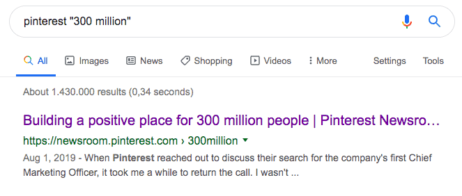 CNN makalesi, Pinterest’i bilginin kaynağı olarak belirtmektedir (“Pinterest bildirildi”), ancak doğrudan bir bağlantı sağlamaz. Yine de bulmak oldukça kolay. Sadece Google “Pinterest” “300 milyon” ve Pinterest’in orijinal duyurusu ilk arama sonucu olarak görünür.